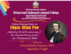 The Department of English, Shivprasad Sadanand Jaiswal College, Arjuni Morgaon, Dist. Gondia (MH), organized an Online National Quiz on the occasion of Edgar Allan Poe’s