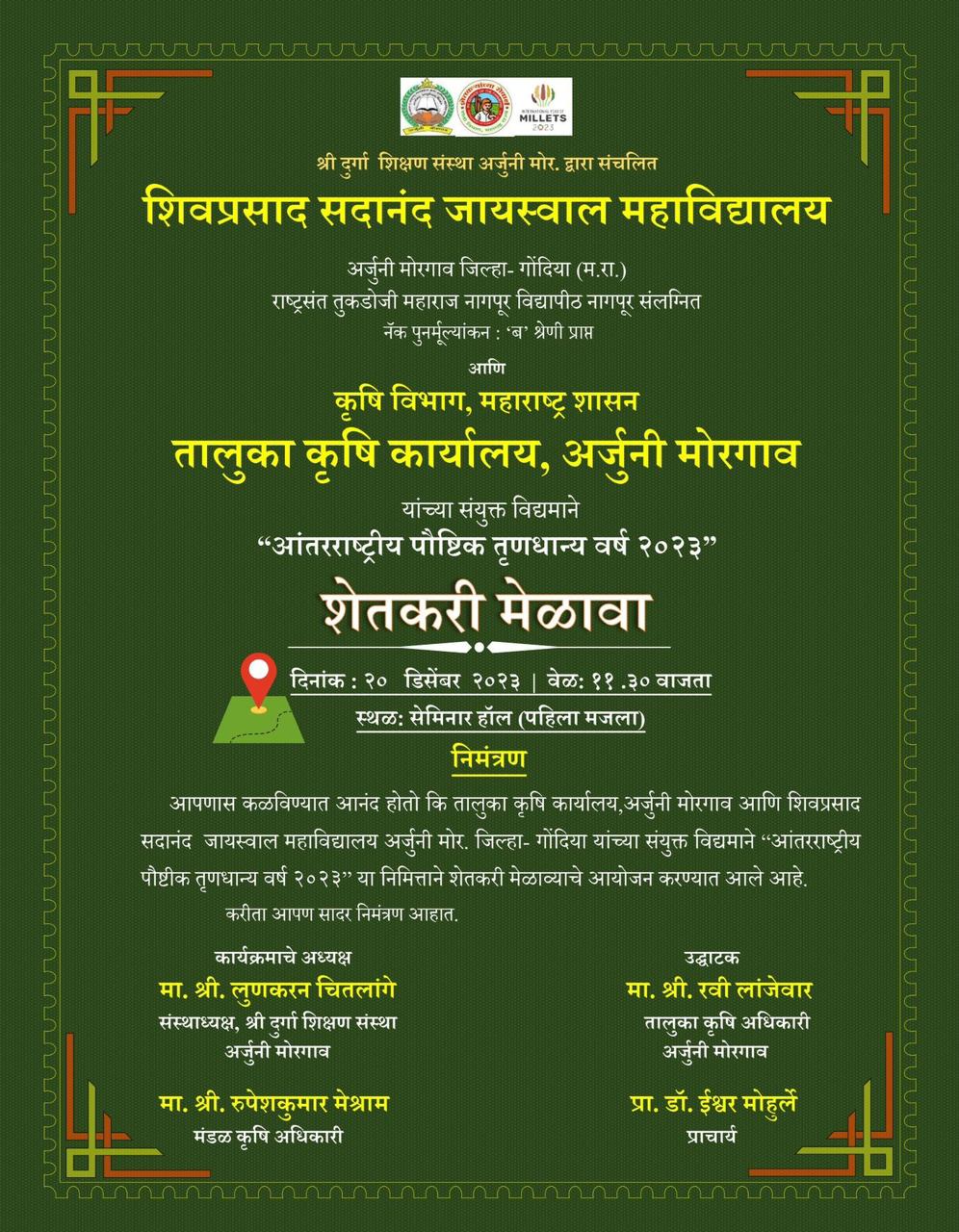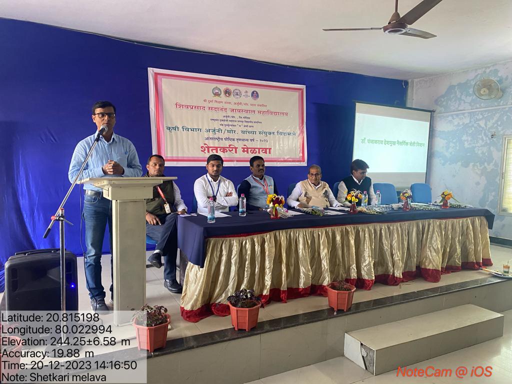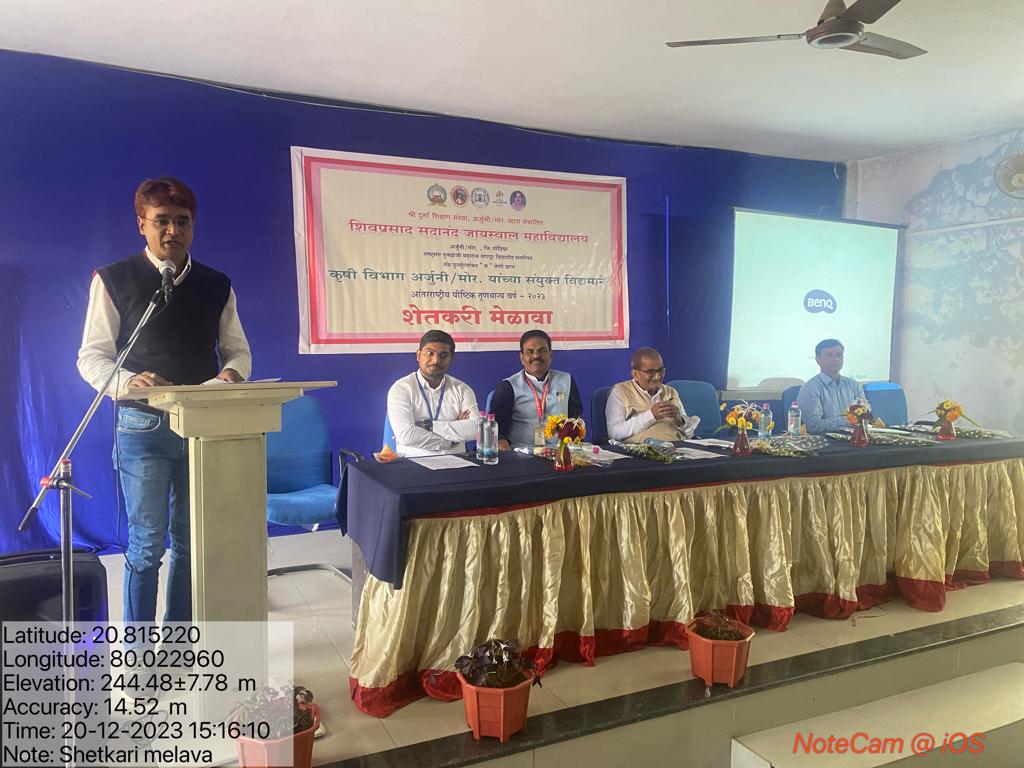 Shivprasad Sadanand Jaiswal College, Arjuni Morgaon, District Gondia, organized a Farmers Meet in collaboration with the Department of Agriculture, Government of Maharashtra, and the Taluka Agriculture Office, Arjuni Morgaon. The event took place on December 20, 2023, at noon in the college seminar hall.