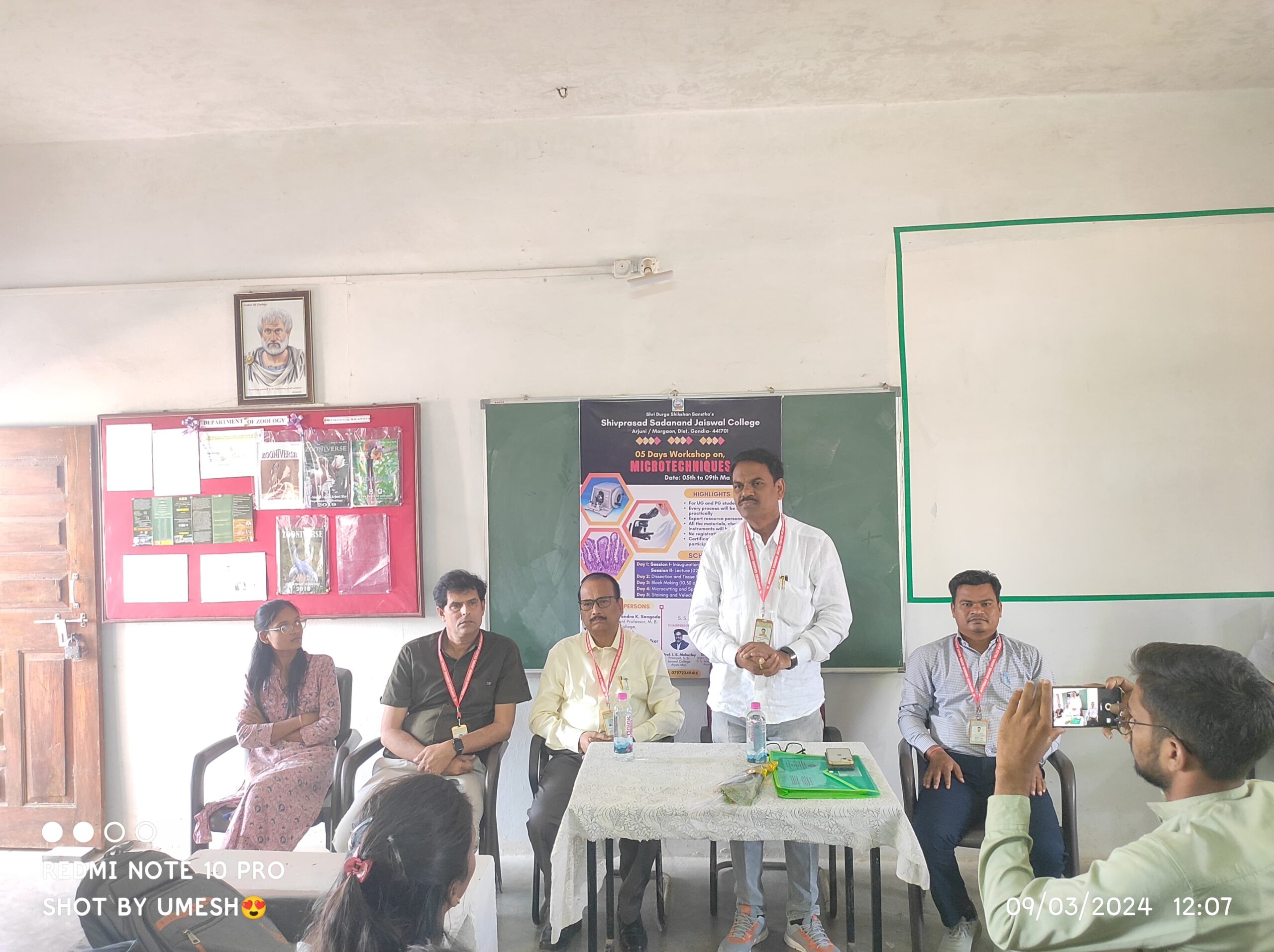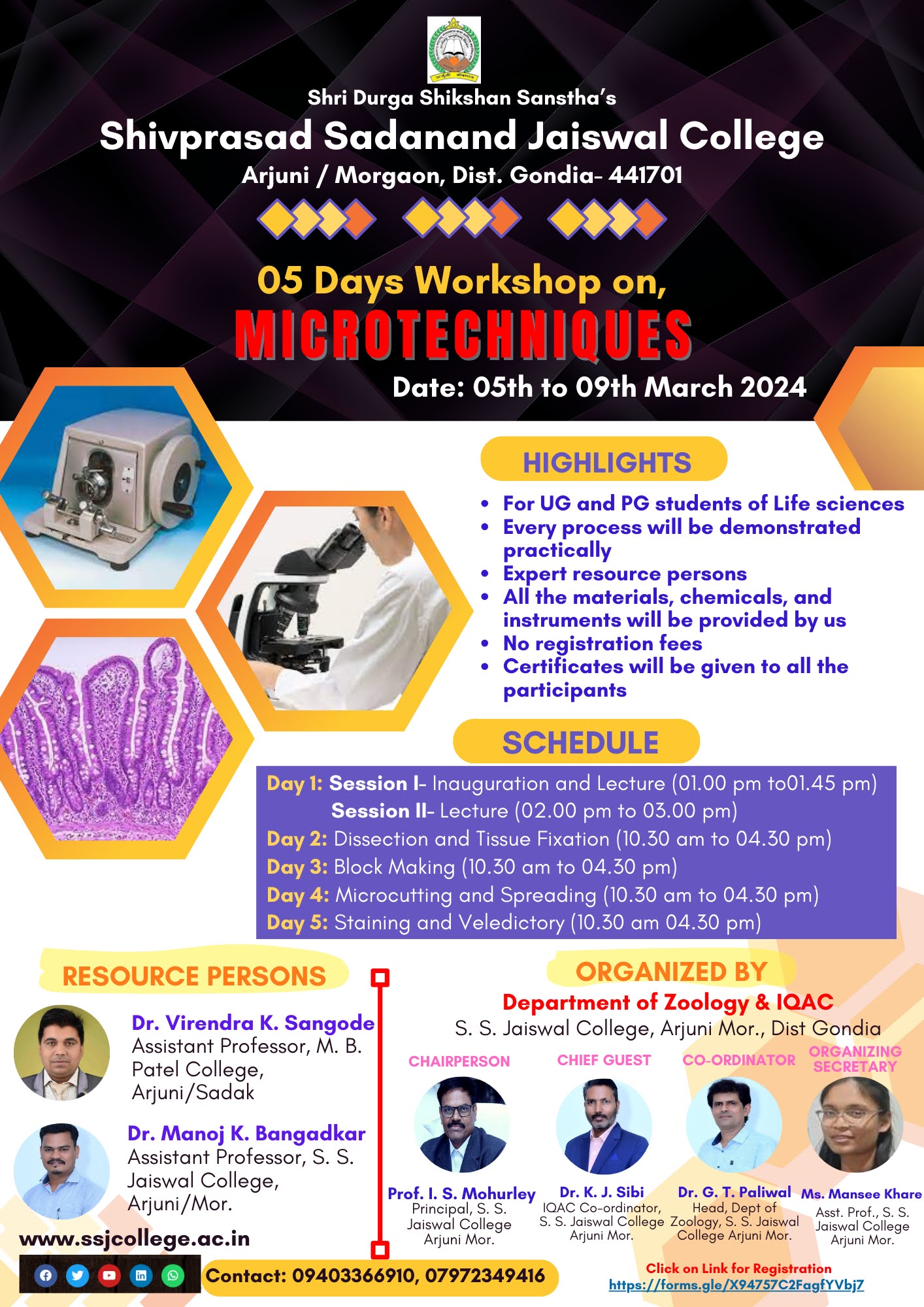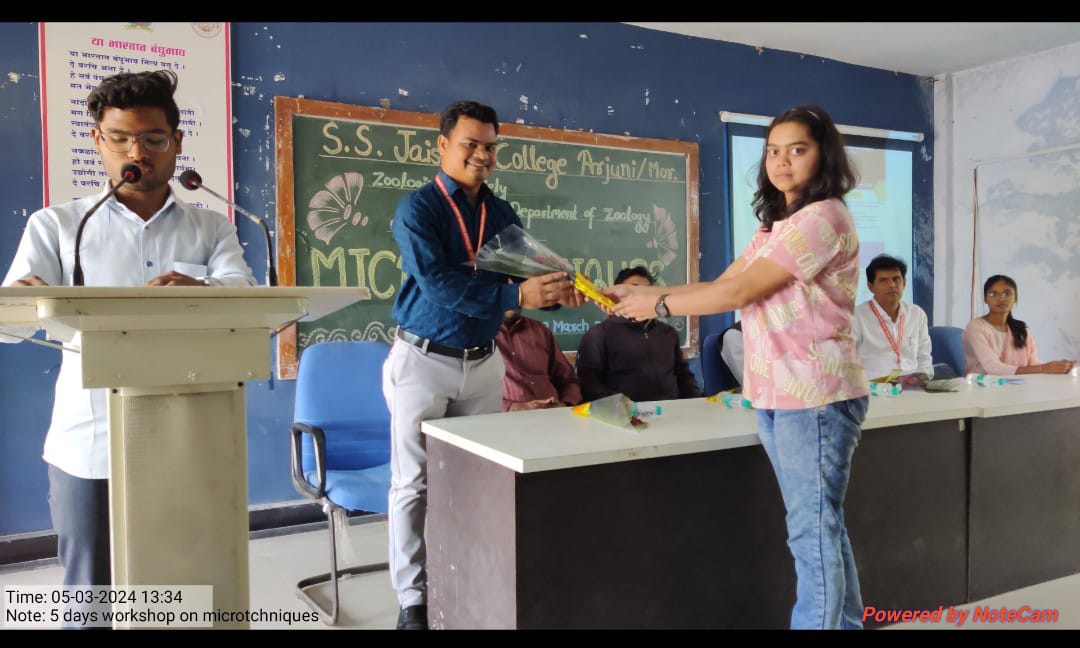A 05 days workshop on the Microtechnique was organized by the department of Zoology, Shivprasad Sadanand Jaiswal College Arjuni morgaon, Dist. Gondia on dated 05th to 09th March 2024. The target group of the workshop was the UG and PG students of different colleges of Nagpur University and faculty members, technicians and laboratory attendants working in the field of life sciences. The workshop was organsied in the able guidance of the respected Principal Prof. Ishwar S. Mohurley sir. The co-ordinator of the workshop was Dr. Gopal Paliwal, Organizing secretary Ms. Mansee Khare and resource persons were Dr. Virendra K. Sangode and Dr. Manoj K. Bangadkar. Total 30 students of the different colleges and 02 faculty members were actively participated in the workshop.