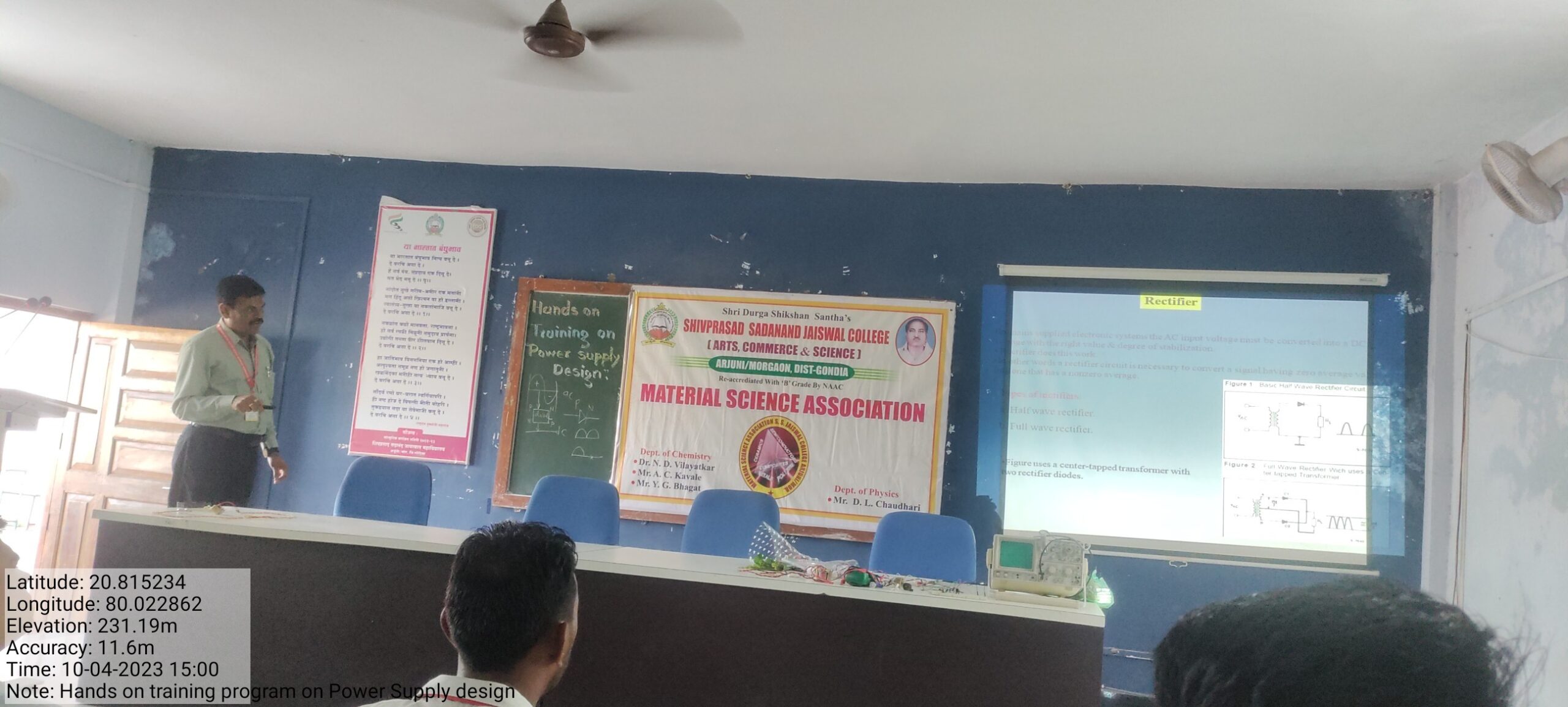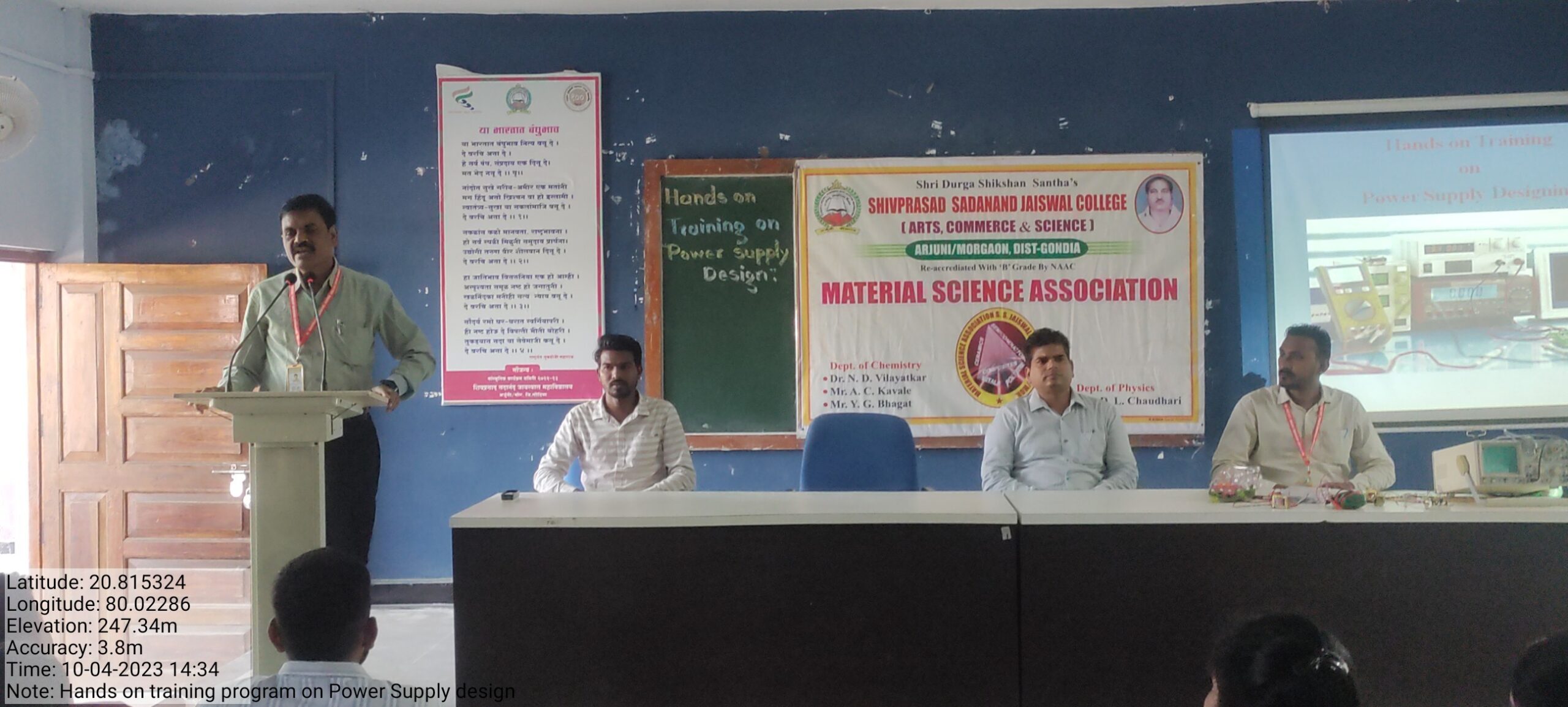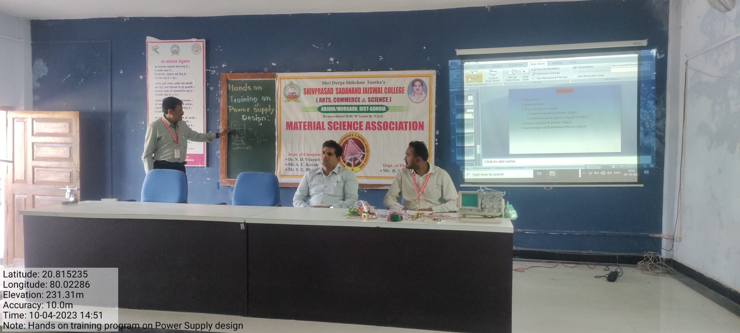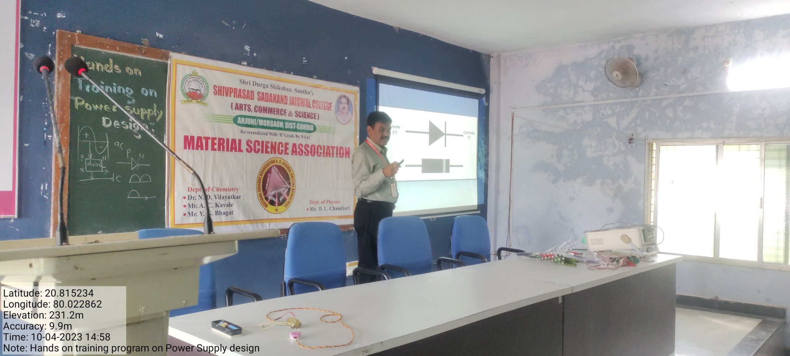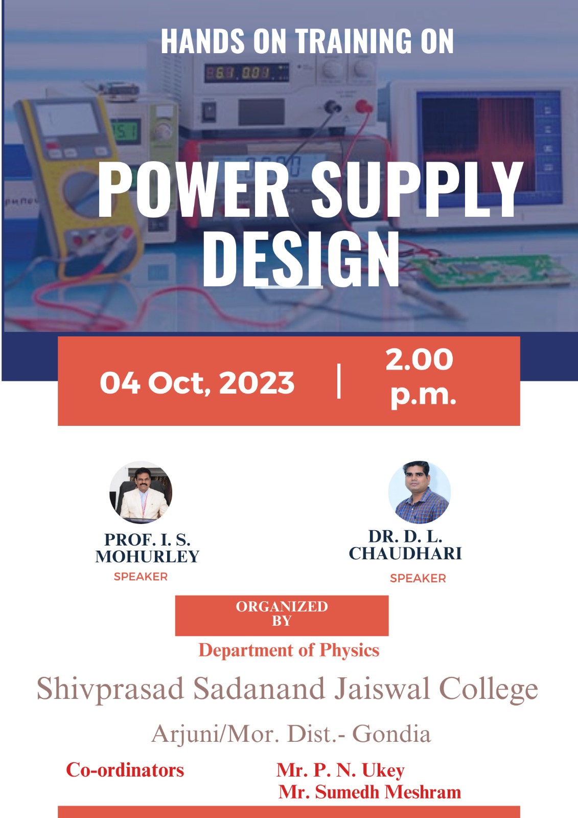 On October 4, 2023 Department of Physics, Shivprasad Sadanand Jaiswal College, Arjuni/Morgaon Dist-Gondia conducted hands-on training program on power supply design, enriching Physics students with practical skills and knowledge that will undoubtedly propel their academic and professional careers forward. The programme is chair by the Prof. I. S. Mohurley, Principal of the College and Resource person of the programme, Dr. D.L. Chaudhari, Head of the Department of Physics, Mr. P. N. Ukey, Assistant Professor Physics, Mr. Sumedh Meshram CHB Lecturer were present. The program’s curriculum was thoughtfully crafted to ensure students grasped fundamental concepts while gaining hands-on experience. Key topics covered included: Basics of Power Supply, Design Components and Circuits in Power Electronics, Safety Protocols and Compliance, Practical Design Challenges, Building Functional Power Supplies. The Student participants eagerly embraced the opportunity to construct power supplies from scratch under the guidance of Dr. D. L. Chaudhari. The highlight of the event was the hands-on lab sessions, where students meticulously assembled and tested their power supply designs, effectively bridging the gap between theoretical knowledge and real-world application. It’s essential for them to experience the practical side of Physics and this workshop has been a remarkable success. It’s anticipated that the knowledge and experience acquired in this workshop will be invaluable as they progress in their academic and professional journeys. The success of the hands-on training program at reflects the importance of practical education in shaping the science of tomorrow. This programme is anchored by Mr. Pratik Chauhan and Vote of Thanks proposed by Chhakuli Gajapure. Efforts are taken from Faculties of the Department of Physics, Dr. G. T. Paliwal HoD Zoology, Mr. Badal Lade Lab Attendant, Gajanan Kolhe and Students for the successes of the Hands on training Programme.