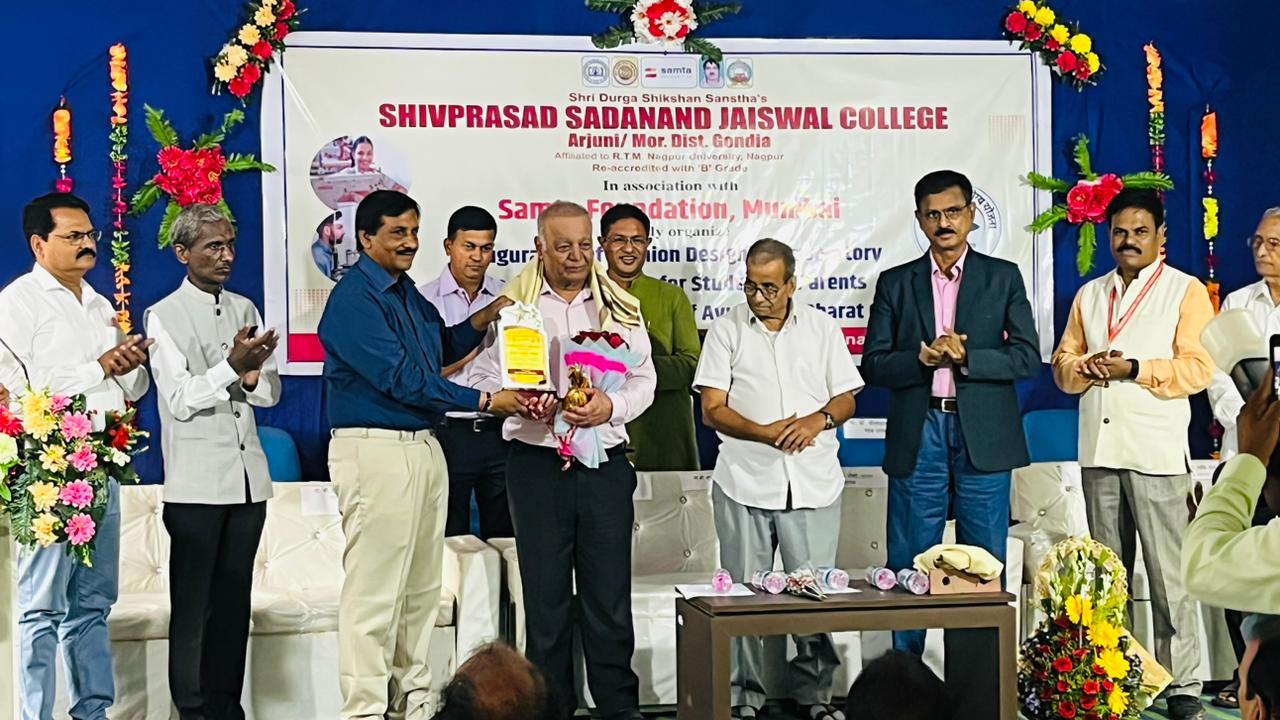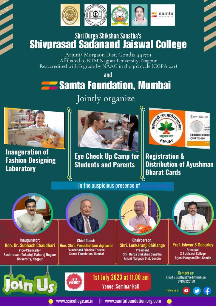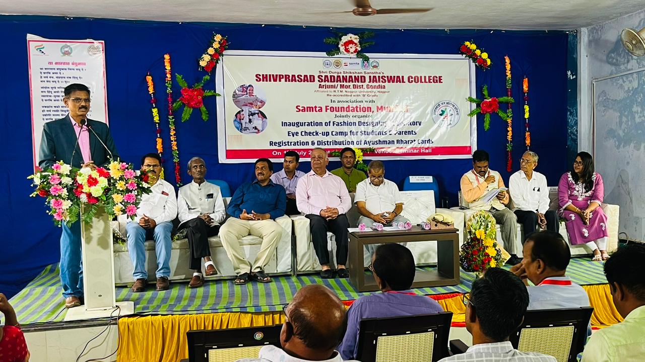 The inauguration ceremony of the Fashion Designing Laboratory, Free eye check-up camp for students and parents and registration and Distribution of Ayushman Bharat Cards took place at Shivprasad Sadanand Jaiswal College in Arjuni Morgaon on 1st July 2023. The laboratory was initiated through a collaboration between the college and the renowned Samta Foundation, Mumbai with generous sponsorship from Ajanta Pharma on the centenary celebration year of Rashtrasant Tukadoji Maharaj Nagpur University, Nagpur. The event was graced by the presence of Hon. Dr. Shubhash Chaudhary, Vice-Chancellor, RTMNU, Mr. Purushottam Agrawal, Founder and Principal Trustee of Samta Foundation. This collaboration ensures that students receive high-quality training and exposure to industry best practices, opening doors to diverse opportunities in the fashion industry. Shri. Lunkaran Chitlanje, President, Shri Durga Shikshan Sanstha, Dr Bhushan Mahajan, Dr Prakash Itanakar, Dr Nishikant Raut, Priyanka Ghule, management secretary Shri Mukesh Jaiswal, Dr. Kailash Gadekar, Dr Ishwar Mohurley, Principal were present on this occasion. Dr Shubhash Chaudhary, VC, RTMNU and Dr Purushottam Agrawal were felicitated with mementoes and floral bouquets.