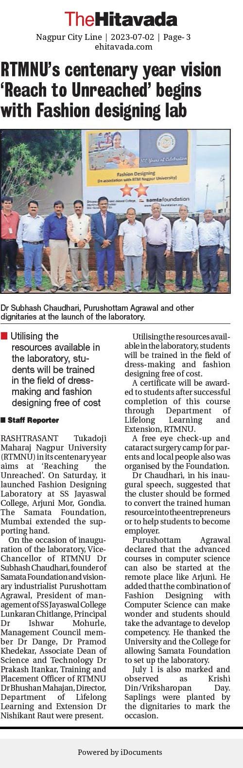 Shri Lunkaran Chitlange congratulated the team of Samta Foundation for their outstanding activities for the welfare of society. He has also thanked for selectingthe college for the inauguration of one of the first Fashion Designing Laboratory in the centenary celebration year of RTMNU.