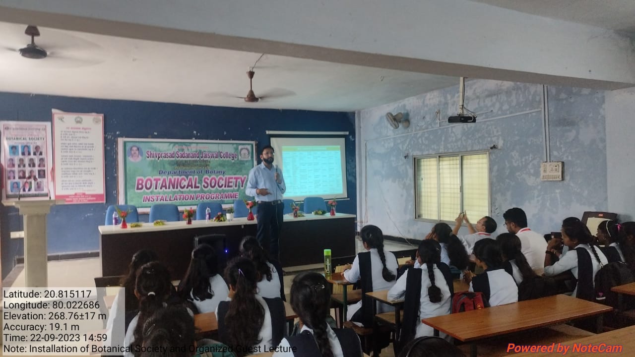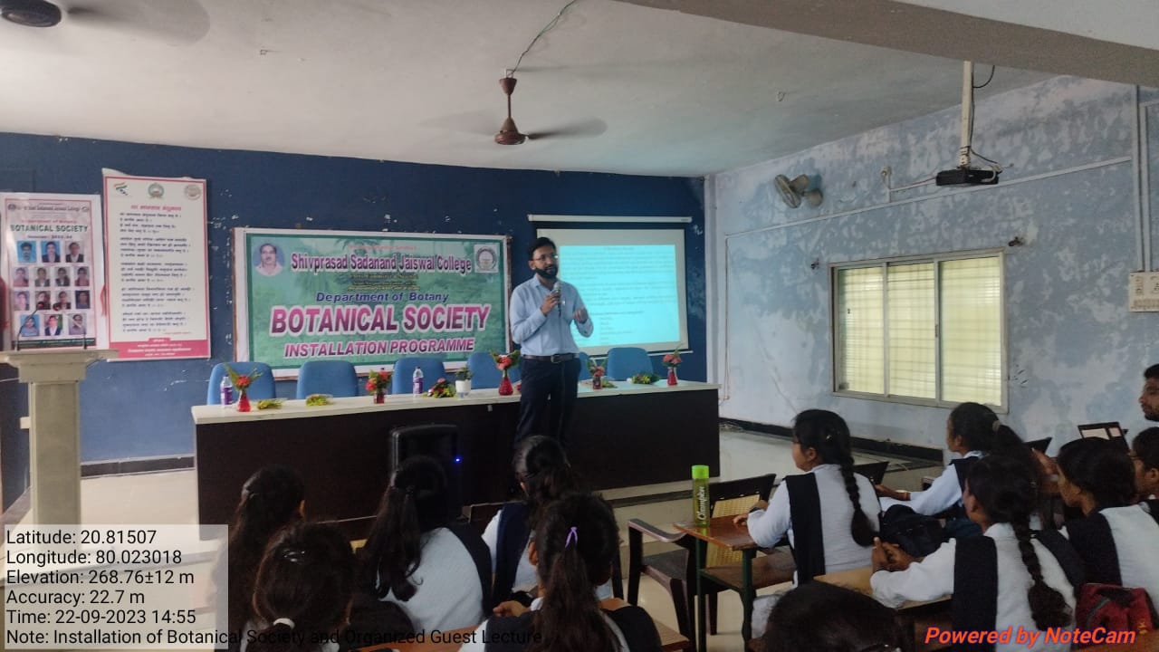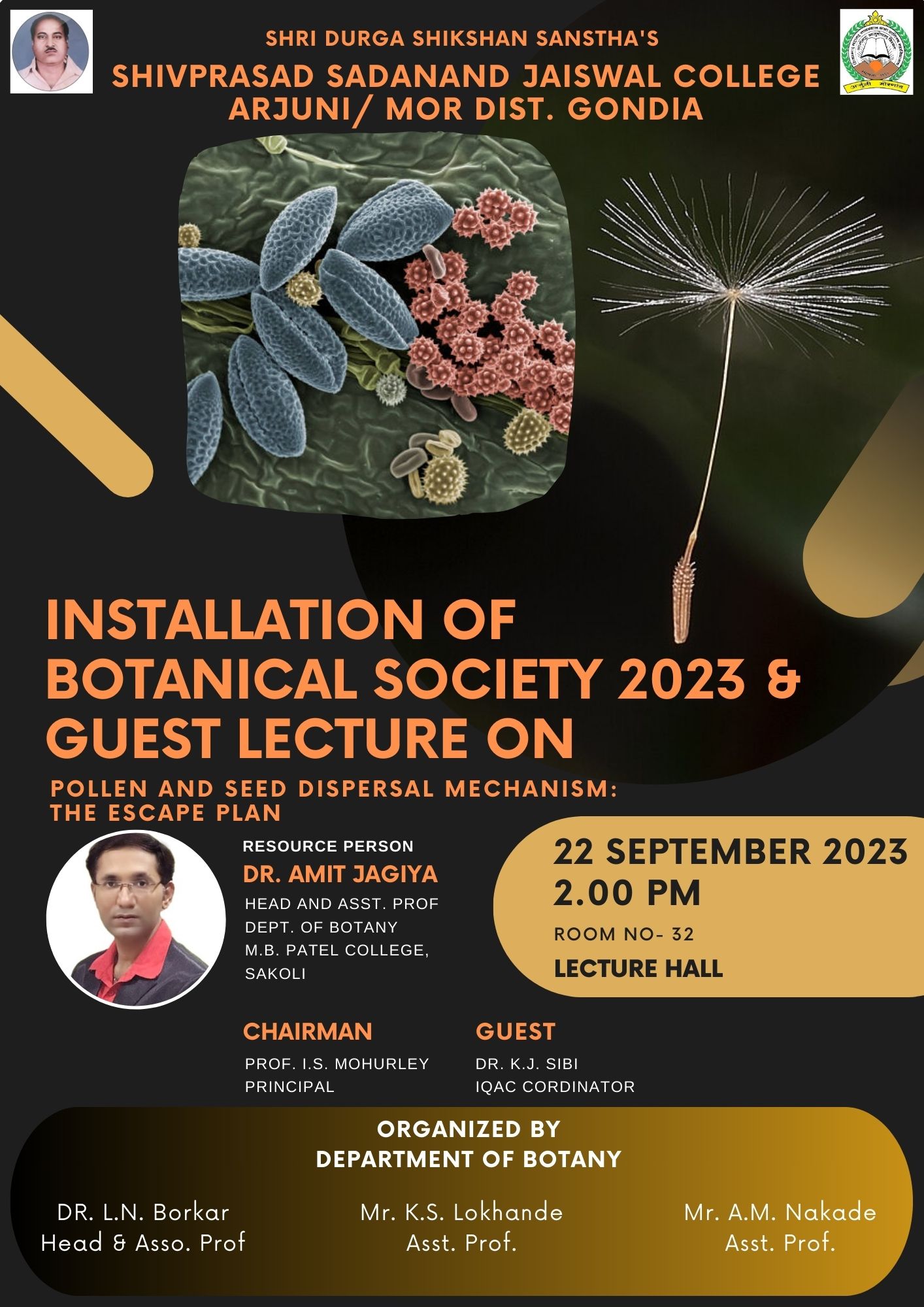 The department of Botany of S.S. Jaiswal College Arjuni/mor organized Installation of Botanical Society 2023-24 and guest lecture on dated 22 September 2023. The chief guest of the program was Dr. Amit Jagiya, Head and Asst. prof., Department of Botany, M.B. Patel College Sakoli., IQAC Coordinator Dr. K.J. Sibi, Dr. L.N. Borkar Head Department of Botany, Mr. Kailash S. Lokhande Asst. Professor, Mr. Ankit Nakade Asst. Professor and President of the program was Principal Prof. Ishwar Mohurley S.S. Jaiswal College Arjuni/mor.
