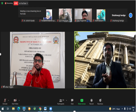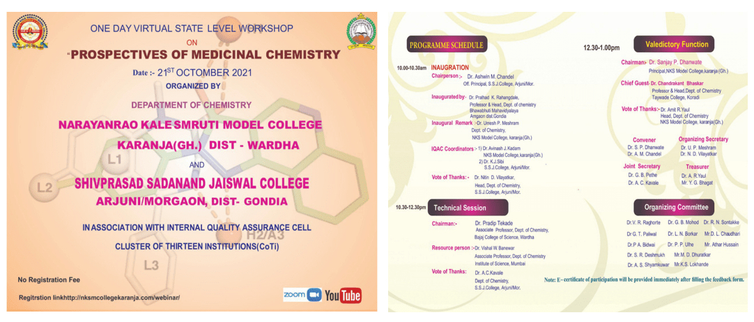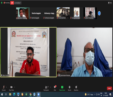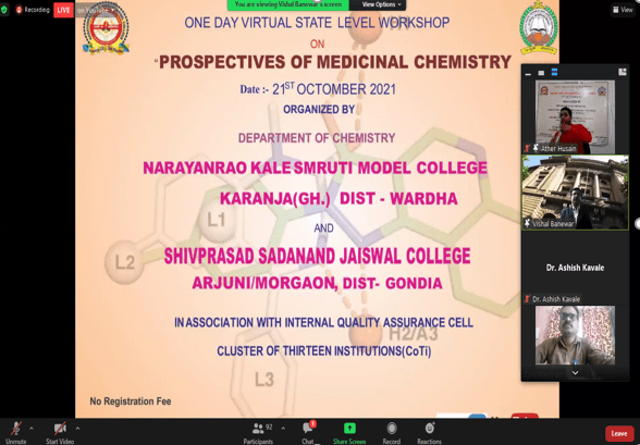 The valedictory function was presided over by Dr. Sanjay P. Dhanwate, Principal, Narayanrao Kale Smruti Model College, Karanja (Gh.) and the chief guests were Dr. Chandrakant    Bhaskar Prof. & Head of Department Chemistry, Taywade College, Koradi. Dr. Chandrakant Bhaskar expressed his views about the ‘Prospective of Medicinal Chemistry’’. He explored the Importance and measures of the recent development of Medicinal Chemistry.  Dr. Sanjay P. Dhanwate summarized the one-day workshop in his presidential speech.