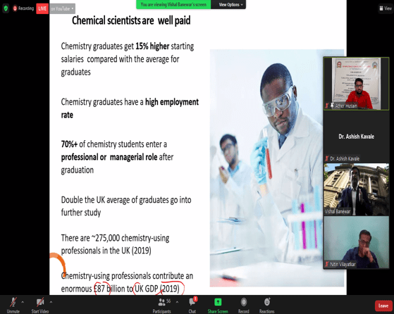 The resource person of the technical session was Dr. Vishal N. Banewar  Associate Professor, Dept. of Chemistry, Institute of Science, Mumbai delivered a talk on ‘Prospective of Medicinal Chemistry. Dr. Banewar described the meaning of the perspective of Medicinal Chemistry. Participants learned about the development of new drugs involving chemical analysis and synthesis. He explained some basic terminology in Medicinal Chemistry, the mechanism of patho-biochemistry of diseases, identification and validation of (emerging) drug targets, and structural biology. In his lecture, he covers drug ability of targets, drug design approaches, chemogenomics, and synthetic chemistry including combinatorial