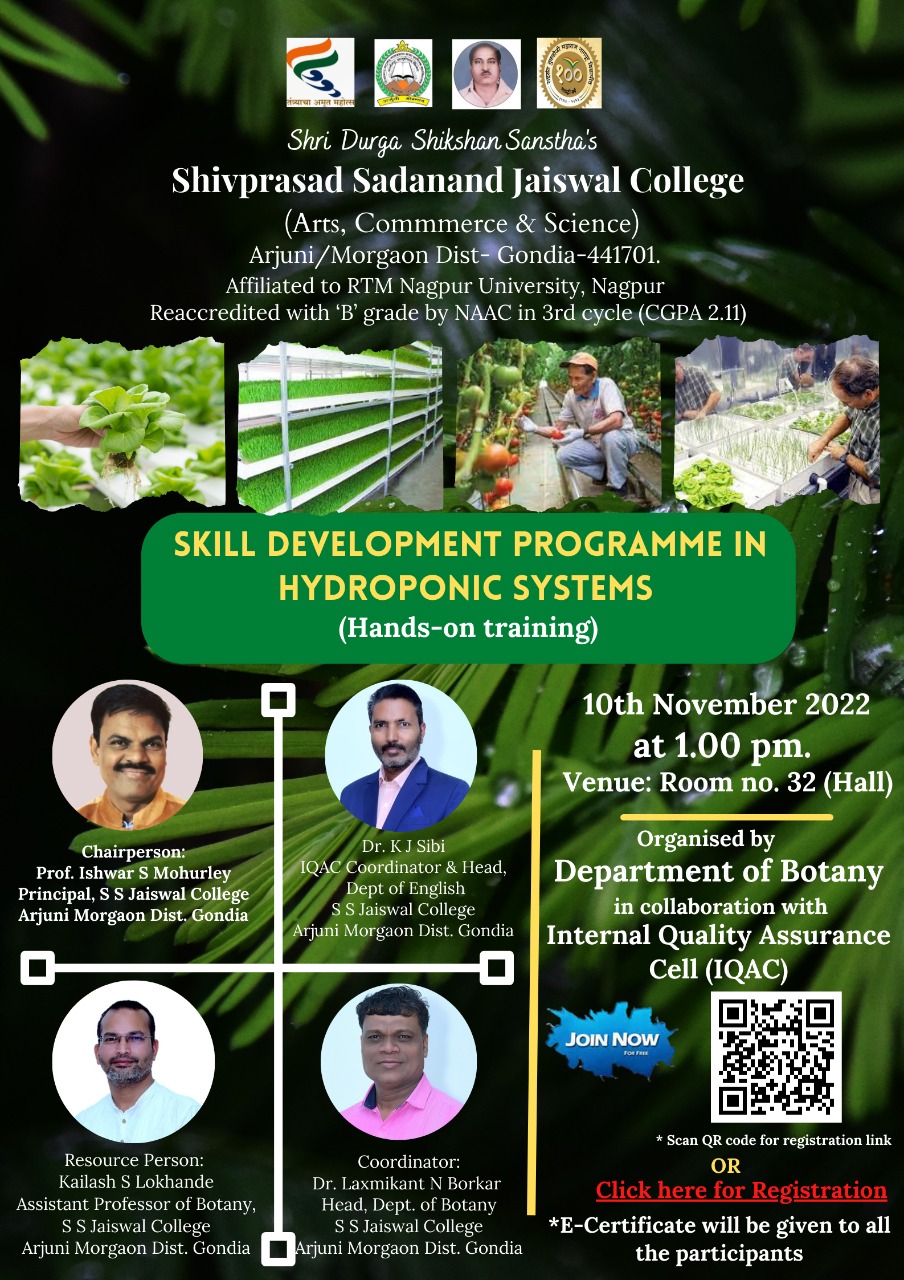 Department of Botany, S.S Jaiswal college, Arjuni/Mor organized a “Skill Development Programme in Hydroponic System (Hands-on training)”on 10th November 2022. The president of this program was Prof. Ishwar Mohurley, Principal, S.S. Jaiswal college Arjuni/Mor. The resource person of the training program was Mr. Kailash Lokhande, Assistant Professor Department of Botany, S.S.Jaiswal college Arjuni/Mor. Dr. K.J.Sibi IQAC coordinator, S.S.Jaiswal college Arjuni/Mor and Dr. Laxmikant N. Borkar, Head Department of Botany, S.S.Jaiswal college, Arjuni/Mor. were also grace the chair for this programme.
