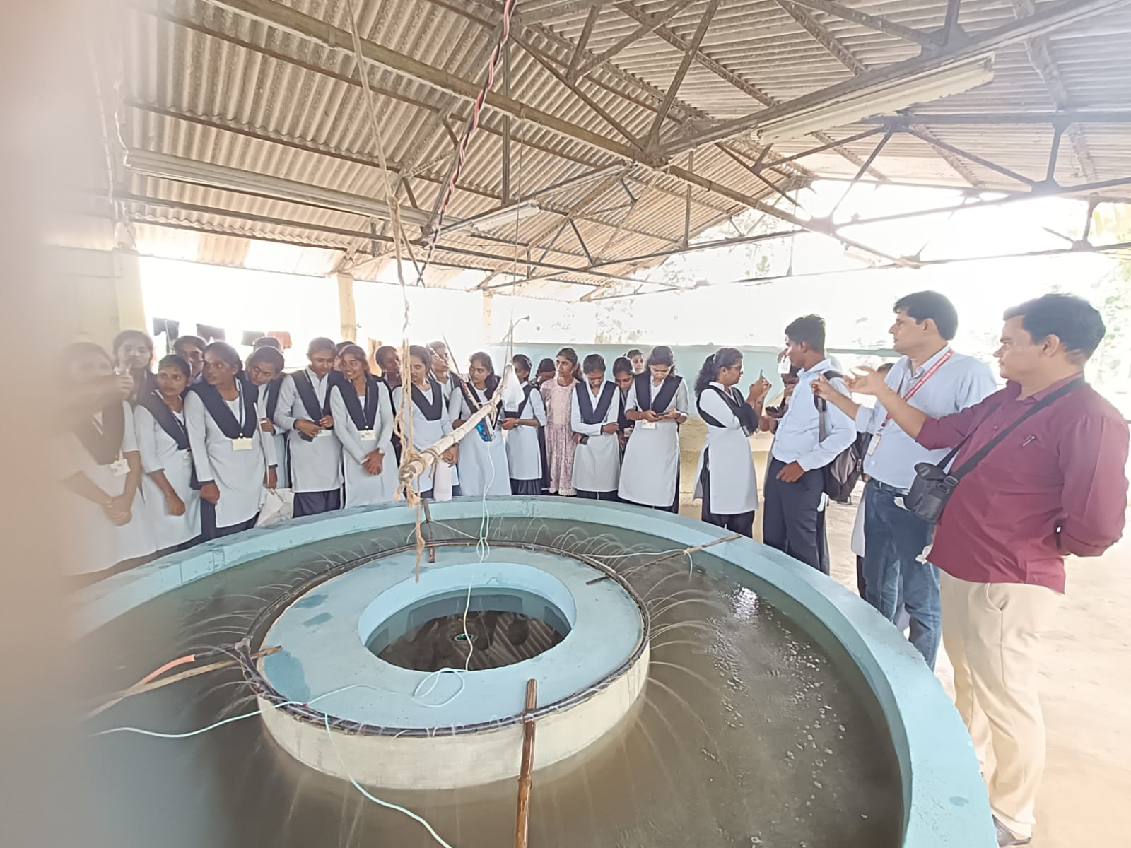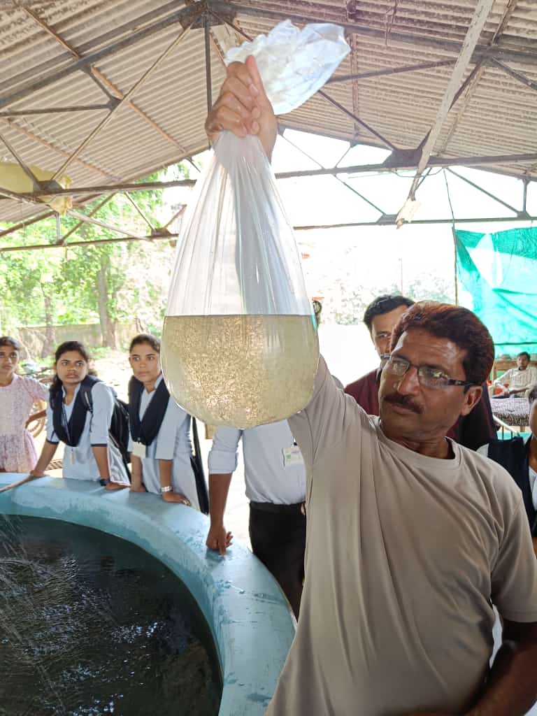 The technique used for the fish seed production i.e. Fish pond management, Induced breeding and Working of Chinese hatchery were explained by the Shri Kailash Marbate Sir, Assistant FDO of the government fish seed production centre. The working of the Chinese hatchery has demonstrated to students. The rearing pond management, management of weeds and packaging of the fish seed is also well explained by technician Shri Dhanuji Shende. After completion of live demonstration, all the students gather near office of fish seed production centre and all the queries of students were solved and explained by the faculty and workers of the fish seed production centre.