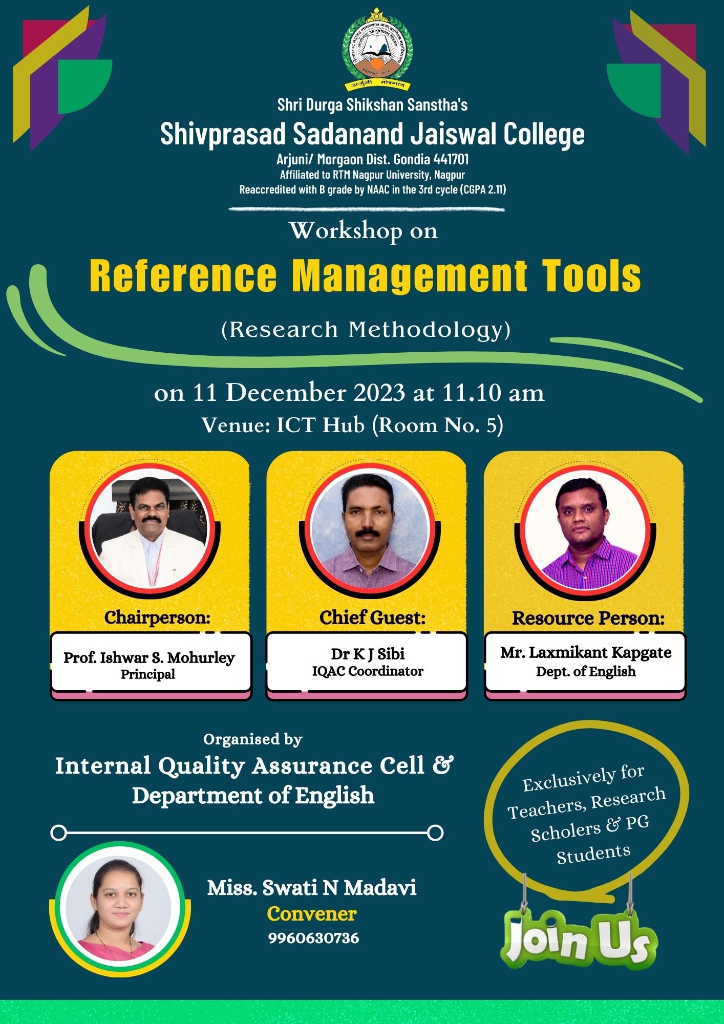 Dr. K J Sibi, IQAC Coordinator, delivered an enlightening introductory remark emphasizing the significance of the workshop and its relevance in the academic domain. Dr. Ishwar Mohurley, Principal, presided over the event, providing valuable guidance and support. he appreciated the effort and initiatives taken by the organizers and also urged the audience to use technological tools in their research work. Miss. Swati Madavi, serving as the session convener, drew insightful comparisons, linking the workshop’s content to its practical applications in research. The workshop witnessed active participation from teachers, postgraduate students, and research scholars, creating a diverse and engaged audience.