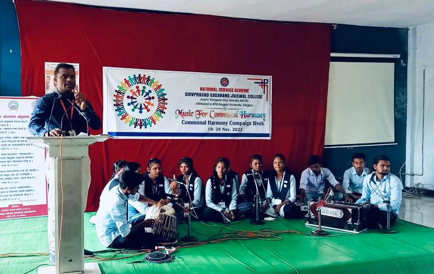 देशात सांप्रदायिक सद्भाव वृध्दिंगत झाल्यास आपोआप जात, धर्म, पंथ, पक्ष यातील विषमता दूर होऊन राष्ट्रीय एकात्मता वाढीस लागते. असे मौलिक विचार राष्ट्रीय सेवा योजनेच्या वतीने दिनांक 23 नोव्हेंबर 2022 रोजी आयोजित करण्यात आलेल्या कार्यक्रमाप्रसंगी महाविद्यालयाचे प्राचार्य प्रा. ईश्वर मोहुर्ले यांनी मांडले. रासेयोच्या विद्यार्थ्यांनी भजन व संप्रदायिक गीते सादर करून राष्ट्रीय एकात्मतेचे दर्शन घडविले. तुकडोजी महाराज यांची बंधुभावाची शिकवण, एकमेका साह्य करण्याचे औदार्य. गरिबांना मदतीचा हात देण्यातच ईश्वर आहे. या भावार्थाची भजने व गीते सादर करून उपस्थितांची मने जिंकली. प्रमुख अतिथी डॉ. के. जे. सीबी यांनीही आपल्या मनोगतातून समायोजित विचार व्यक्त केले बादल गणवीर, अजित ठलाल, शालिनी गेडाम, वैष्णवी नाकाडे यांनी गायलेल्या सुमधुर गीतांना यामिना नागोसे व इतर सहकाऱ्यांनी साजेसा कोरस दिला. तबलावादन बादल गणवीर यांनी तर अजित ठलाल यांनी हार्मोनियमवर साथ दिली. पराग नंदेश्वर यांनी ऑर्गनवर सोबत केली. कार्यक्रमाचे प्रास्ताविक राष्ट्रीय सेवा योजना कार्यक्रम अधिकारी डॉ. मोतीलाल दवे यांनी तर सूत्रसंचालन , निवेदन व आभार लक्ष्मीकांत कापगते यांनी मानले.