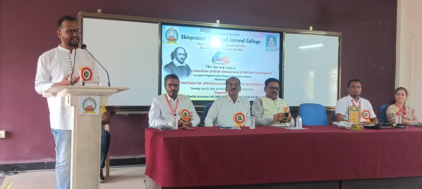 अर्जुनी मोर. २३ एप्रिल: येथील शिवप्रसाद सदानंद जायस्वाल महाविद्यालयात इंग्रजी आणि मराठी विभाग यांच्या विद्यार्थीकेंद्रित “द लिटररी नेक्सस” आणि अंतर्गत गुणवत्ता हमी कक्ष यांच्या वतीने काल्पनिक नाटककार विल्यम शेक्सपियर यांच्या जयंतीनिमित्त विद्यार्थ्यांसाठी डिजिटल साक्षरता या उपक्रमांतर्गत ‘आधुनिक वर्गशाळांमध्ये मुक्त शैक्षणिक साधनांसाठी एआय-प्रेरित धोरणे’ या विषयावरील कार्यशाळा हा शैक्षणिक कार्यक्रम आयोजित केला.